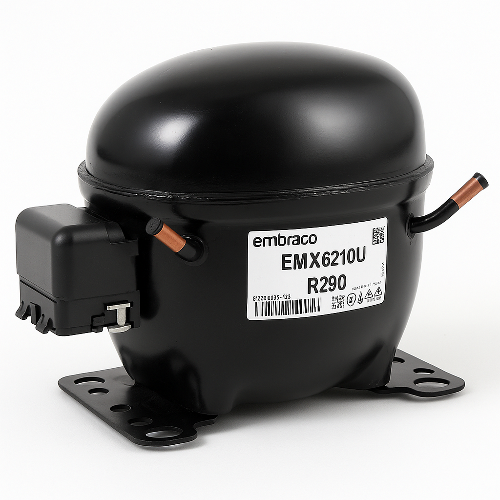 Compresorul Embraco EMX6210U este un model hermetic reciprocant de 1/3 CP, conceput pentru aplicații comerciale de temperatură medie și pentru echipamente care utilizează agentul frigorific R290 (propane).