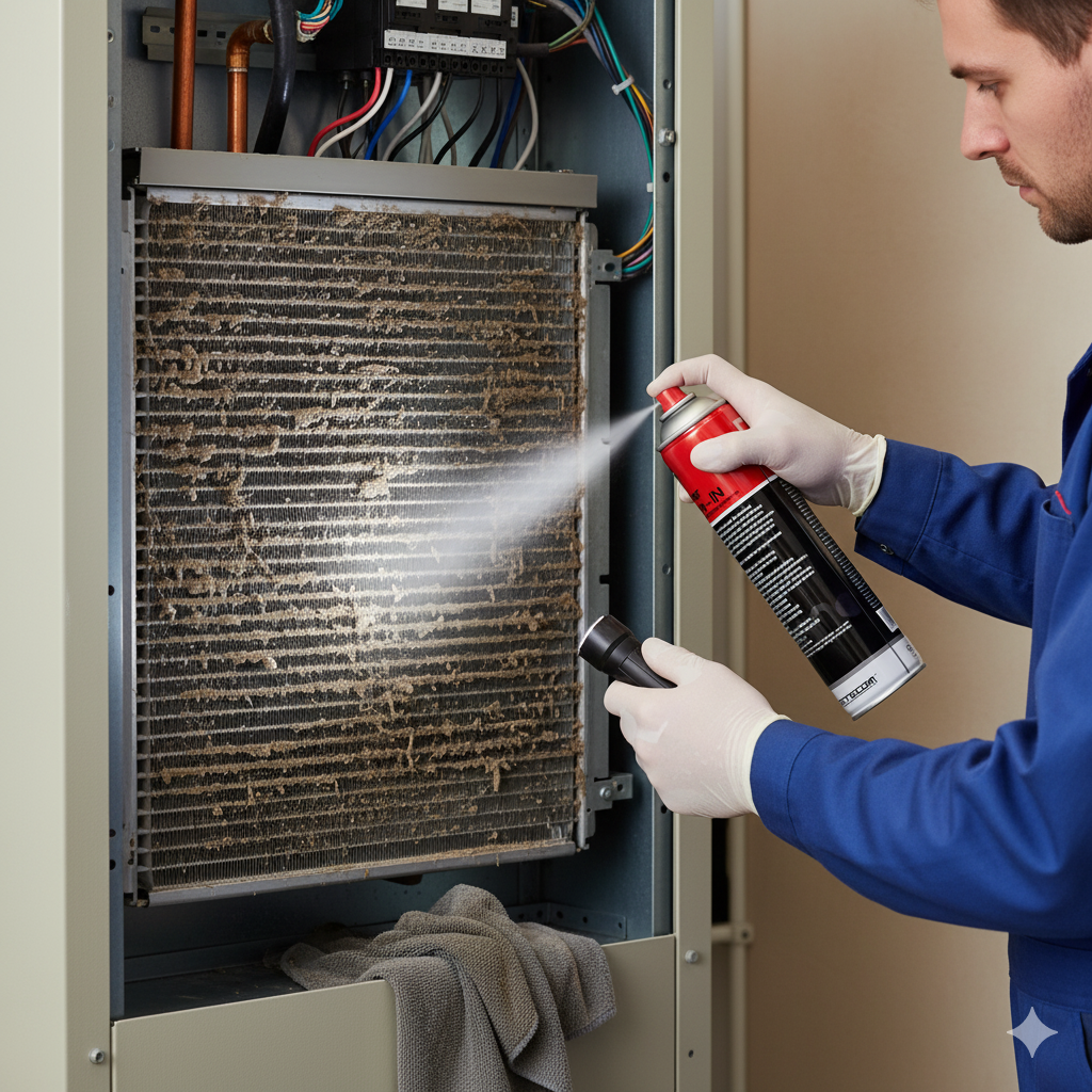 3️⃣ Pulverizează uniform de la o distanță de 20–30 cm pe întreaga suprafață a vaporizatorului (între lamele).